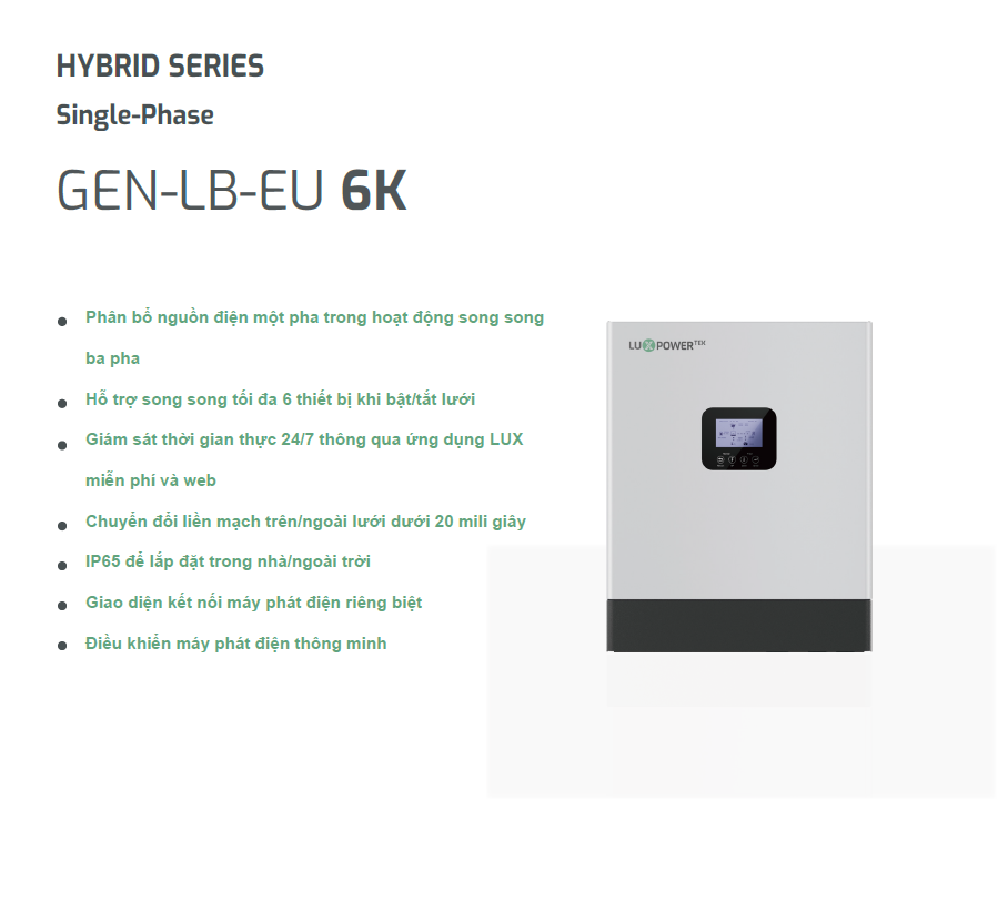 Inverter Hybrid Luxpower GEN 6kW thế hệ thứ 2 là dòng sản phẩm mới của LuxPower, được cải tiến từ thế hệ trước với nhiều cải tiến vượt trội từ hiệu suất cho đến thiết kế, với những cải tiến mới LuxPower GEN 6K thế hệ thứ 2 hứa hẹn sẽ là dòng sản phẩm phù hợp với mọi nhu cầu cho người dùng năng lượng mặt trời. Với công suất 6Kw, Luxpower GEN 6kW giúp cung cấp nguồn điện hàng ngày để giảm hoá đơn tiền điện và là máy phát điện dự phòng khi mất điện lưới quốc gia.